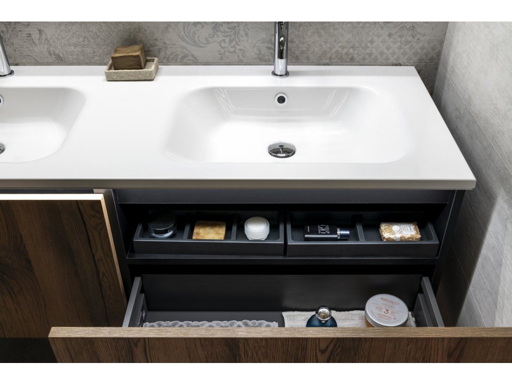 Uvnitř skříňky je nad zásuvkou praktická police na drobnosti každodenní potřeby. Pod hranu umyvadla lze instalovat tlumené LED osvětlení, které pro jeho nízkou spotřebu (1W) není nutné vypínat.