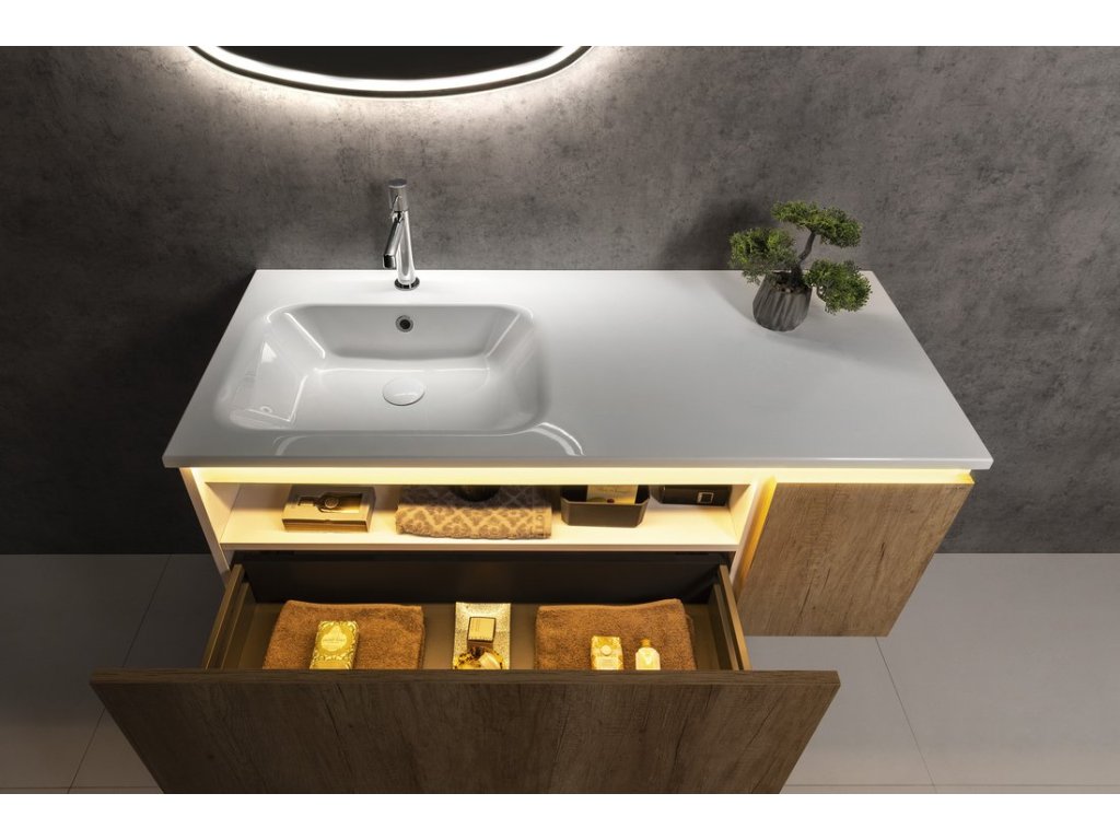 Uvnitř skříňky je nad zásuvkou praktická police na drobnosti každodenní potřeby. Pod hranu umyvadla lze instalovat tlumené LED osvětlení, které pro jeho nízkou spotřebu (1W) není nutné vypínat.