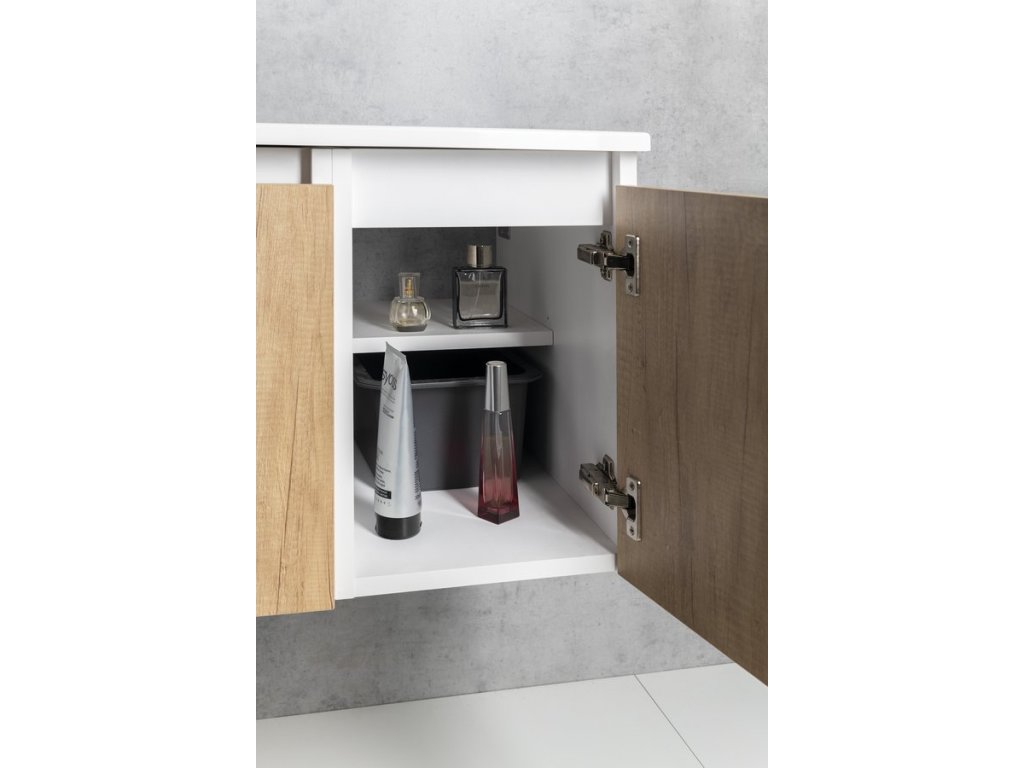 Uvnitř skříňky je nad zásuvkou praktická police na drobnosti každodenní potřeby. Pod hranu umyvadla lze instalovat tlumené LED osvětlení, které pro jeho nízkou spotřebu (1W) není nutné vypínat.
