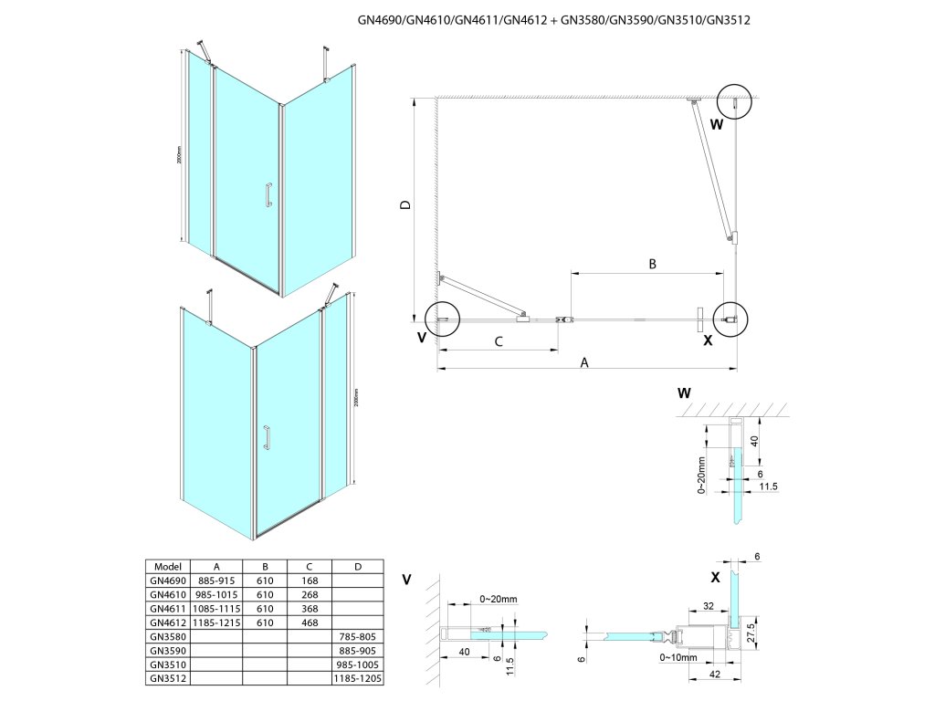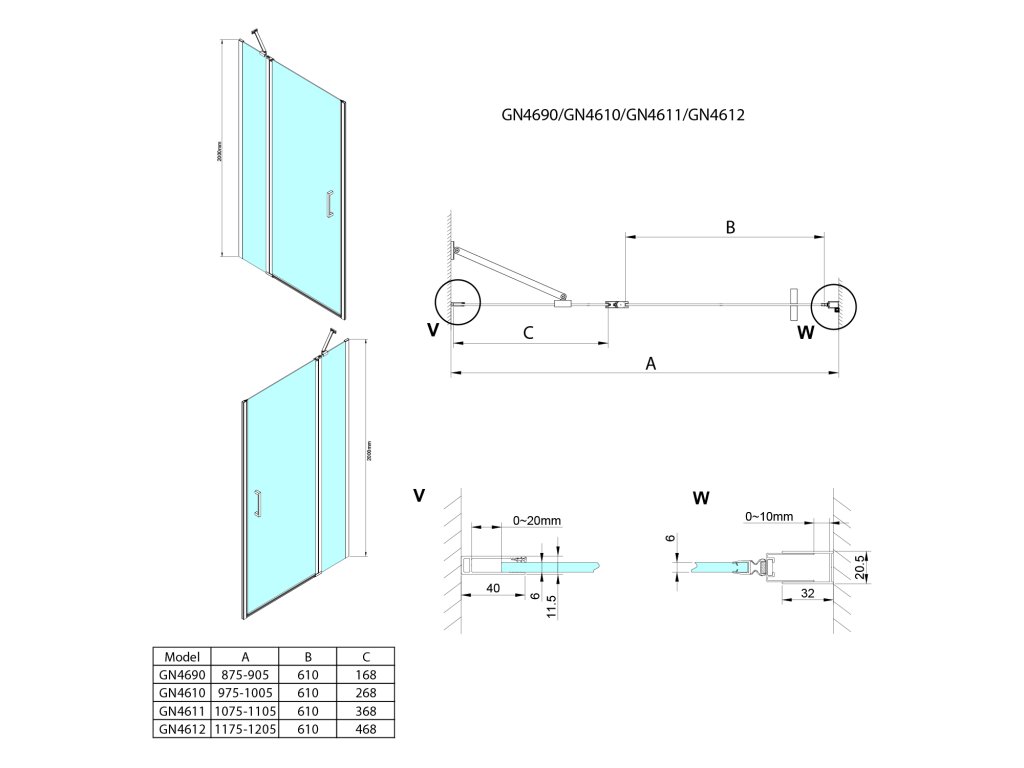 - Dveře je možno instalovat do niky nebo v kombinaci s boční stěnou