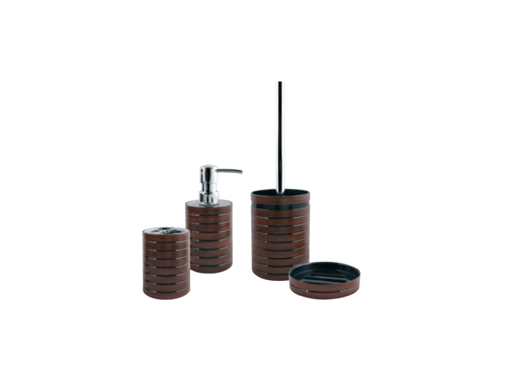 Sérii MADERA je tvořena kelímkem na zubní kartáčky, mýdelníkem, WC štětkou a dávkovačem mýdla.