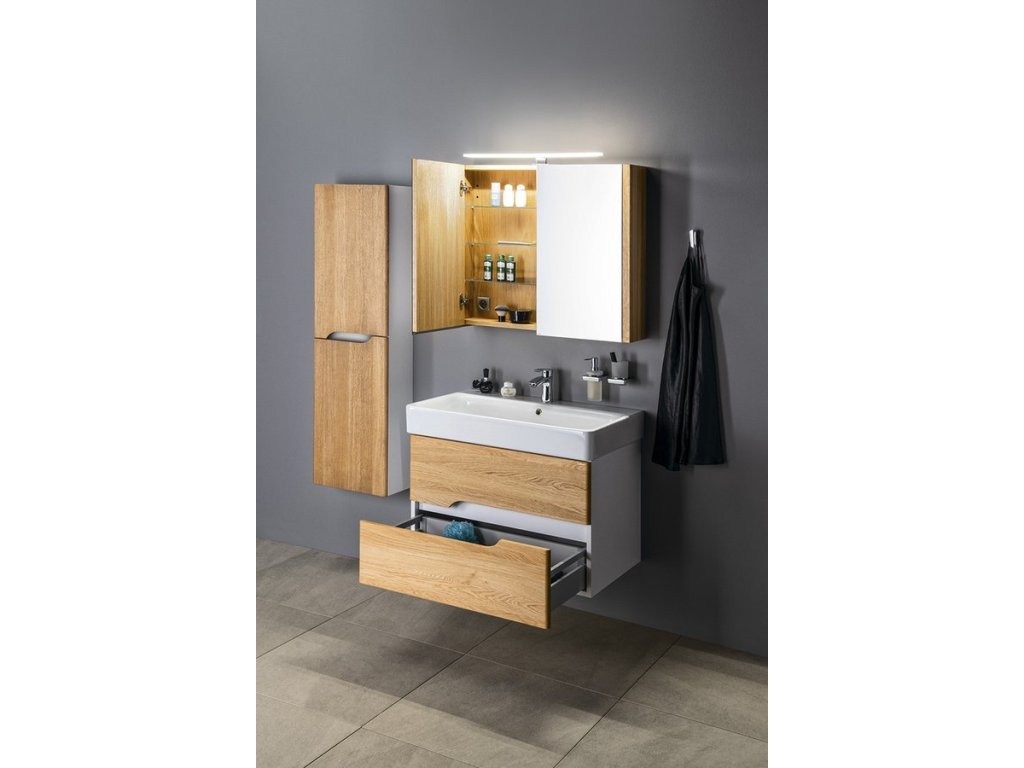 Série MEDIENA je kombinací bílé matné barvy a zásuvek z masivního dřeva, které svým zaoblením kopírují tvar keramických umyvadel SAND od italského výrobce GSI. Zásuvky s netradičním tvarem výřezu pro otvírání jsou vybaveny výsuvy BLUM s funkcí tlumení BLUMOTION s doživotní zárukou. Skříňky nabízíme buď celé v bílém matném provedení nebo v kombinaci korpus matná bílá a čela zásuvek ve 2 dekorech dubového dřeva (voskový olej dub natural a dub graphite). Šířky skříněk jsou 60, 80, 100 a 120 cm. V nabídce jsou též 2 typy doplňkových policových skříněk. Skříňku s prádelním košem získáte jednoduchým vyjmutím spodní police u doplňkové skříňky šíře 35 cm a instalací látkového prádelního koše na suchý zip.