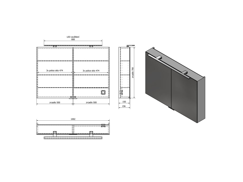 | Výbava: | Osvětlení;Integrovaná el. zásuvka;Oboustranná zrcadlová dvířka;Zpomalovací panty |