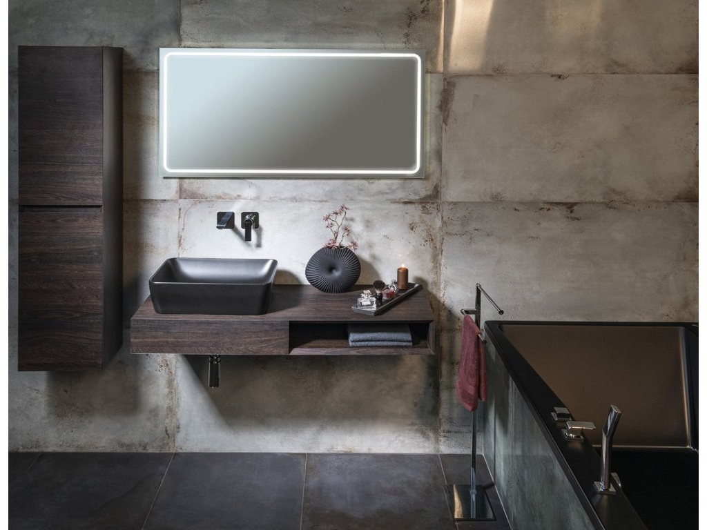 Kolekci doplňují vysoké skříňky ve stejném stylu se zkosenými hranami čela. Dvířka jsou bezúchytková, otevírají se tahem a jsou vybavena zpomalovacími panty.