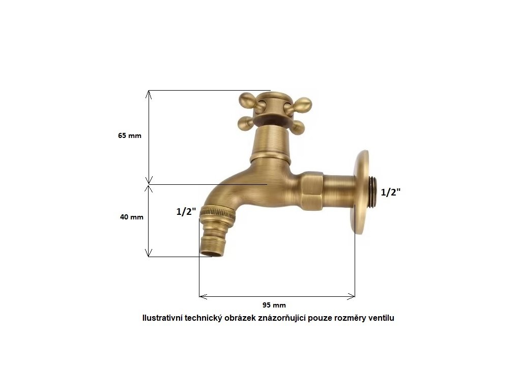 Nástěnný retro ventil 95 mm s perlátorem. Lze dokoupit adaptér s vnitřním závitem 1/2" na připojení rychlospojky viz souv. produkty.