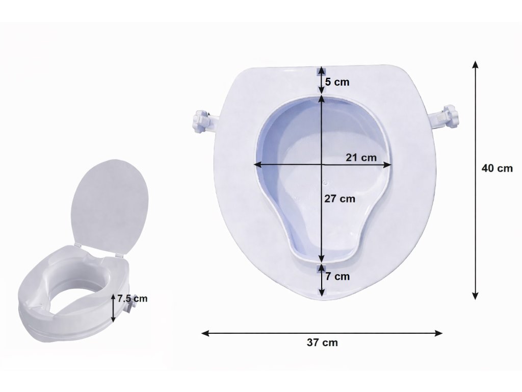 Plastový nástavec doplněný sklopným víkem, které umožňuje toaletní mísu po použití zakrýt. Instalace pomocí dvou aretačních šroubů je velmi snadná. Nástavec má vpředu i vzadu hygienický výřez. Výška 7,5 cm, nosnost 120 kg.