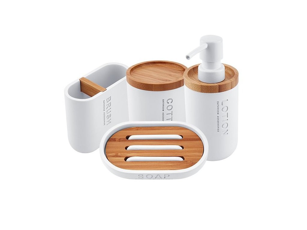 V sadě dávkovač, mýdlenka, dóza na kartáčky a dóza na tampóny. Barva bílá. Materiál polyresin, bambusové dřevo. Obsah dávkovače 270 ml.