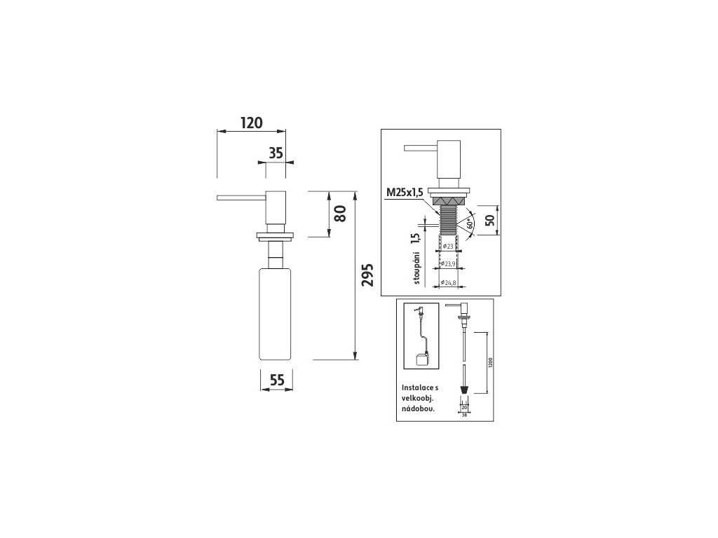 Dávkovač se plní shora přes vyjímatelnou pumpičku, nebo lze za pomoci 1,2 m dlouhé připojovací hadičky připojit dávkovač ke kanystru, který lze ponechat ve skříňce pod dřezem.