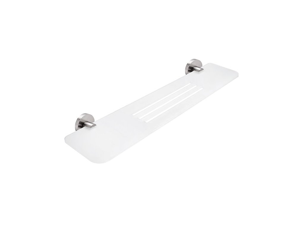 Police s frézovanými otvory s matovanými sklenkami. Šířka matované police plexiglass 60 cm. Barva/úprava: Chrom
