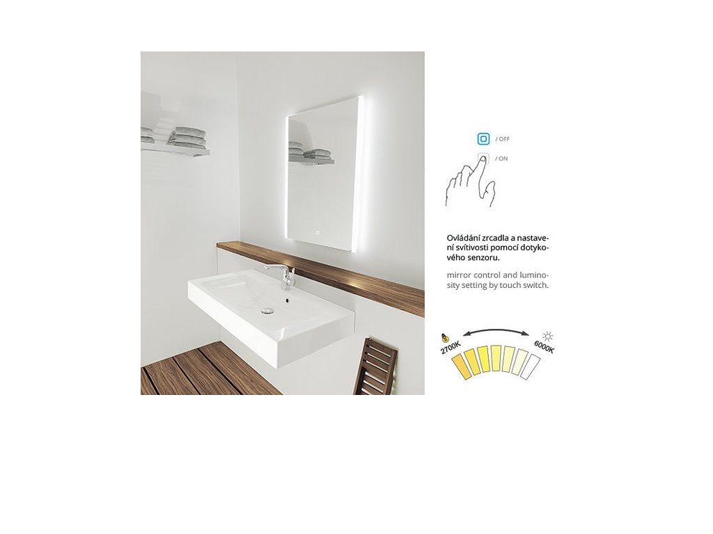 Nová technologie svícení za použití akrylátového skla-plexiglass. Konstrukce z hliníkového rámu 32×19mm. Sklo zrcadla tloušťka 5mm. Připojení 220–240V. Zapínání/vypínání/ovládání dotykovým senzorem. Ochrana IP 44. Použité LED čipy o vysokém výkonu. Možnost nastavení barevné teploty svícení od 2700K – 6000K. Lumen 1920, spotřeba-výkon 21W.