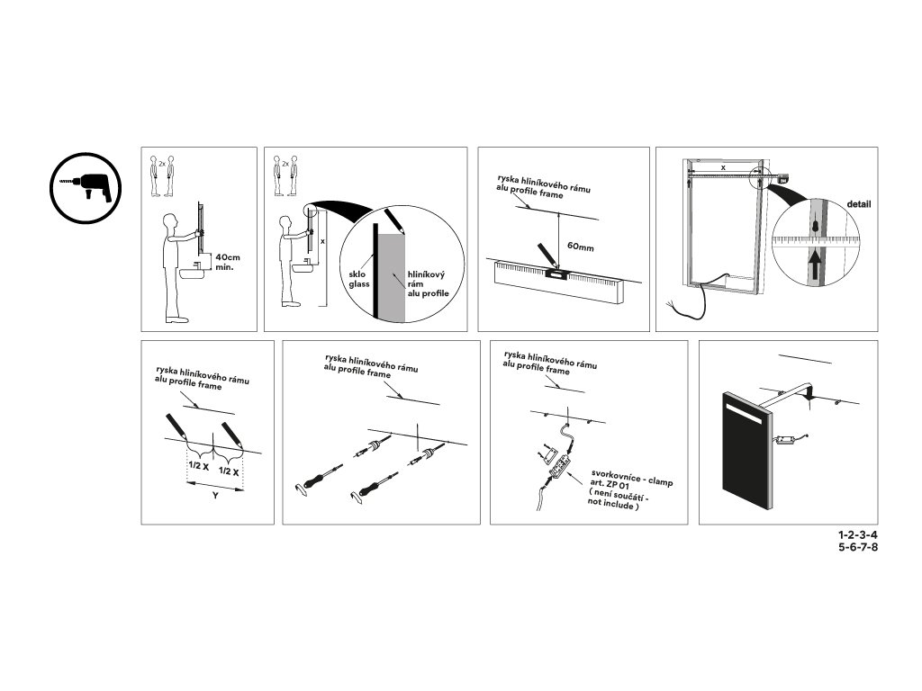 Nová technologie svícení za použití akrylátového skla – plexiglass. Konstrukce je z hliníkového rámu 32×19 mm, sklo zrcadla o tloušťce 5mm. Připojení 220–240 V. Zapínání / vypínání / ovládání dotykovým senzorem s pamětí. Možnost nastavení barevné teploty svícení. Životnost LED diod je až 50 000 hodin. Ochrana IP 44. POVRCHOVÁ ÚPRAVA: rám hliníkový MATERIÁL: sklo + hliník Technický list GENERÁLNÍ KATALOG & CENÍK NÁVOD K MONTÁŽI – VRTÁNÍ NIMCO všeobecný ilustrovaný návod k montáži výrobků.