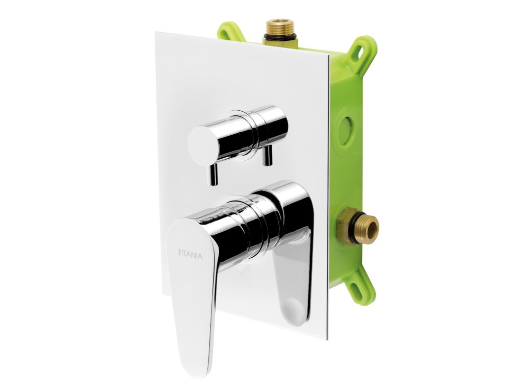 Kvalitní a odolná keramická kartuše 35 mm s prodlouženou zárukou 5 let. Prvotřídní chromové provedení. Podomítková baterie s boxem pro 2 vývody vody a s keramickým přepínačem. Box je dodávaný komplet včetně krytu a ovládací páky. Součástí je vodováha pro snadnou a přesnou montáž.