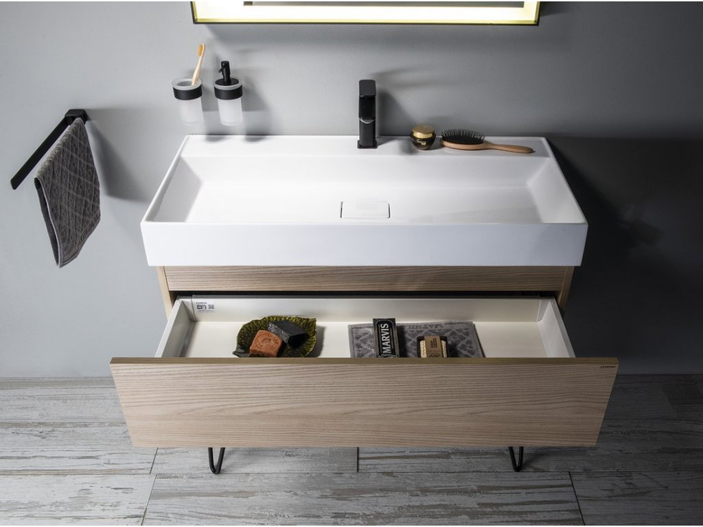 Série ODETTA nabízí umyvadlové skříňky v kombinaci se 3 druhy umyvadel - keramická KARE, z litého mramoru GODIVA a betonová QUADRADO. Série je také navržena pro vybraná umyvadla na postavení. Rozměrovou variabilitu umožňuje kombinace umyvadlových a spodních skříňek. Bezúchytkové zásuvky jsou vybaveny výsuvy BLUM s tlumeným dovíráním. Horní zásuvka je bez výřezu pro sifon, čímž se zvyšuje úložná plocha zásuvky. Mezi zásuvkami je hliníková lišta CHANEL v černé nebo bílé barvě. Na přání lze dodat lištu i ve zlaté barvě.