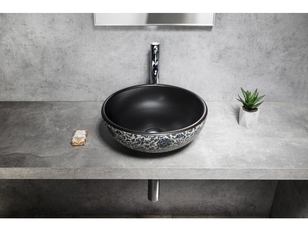 PRIORI keramické umyvadlo na desku, Ø 41cm, černá s modrým vzorem