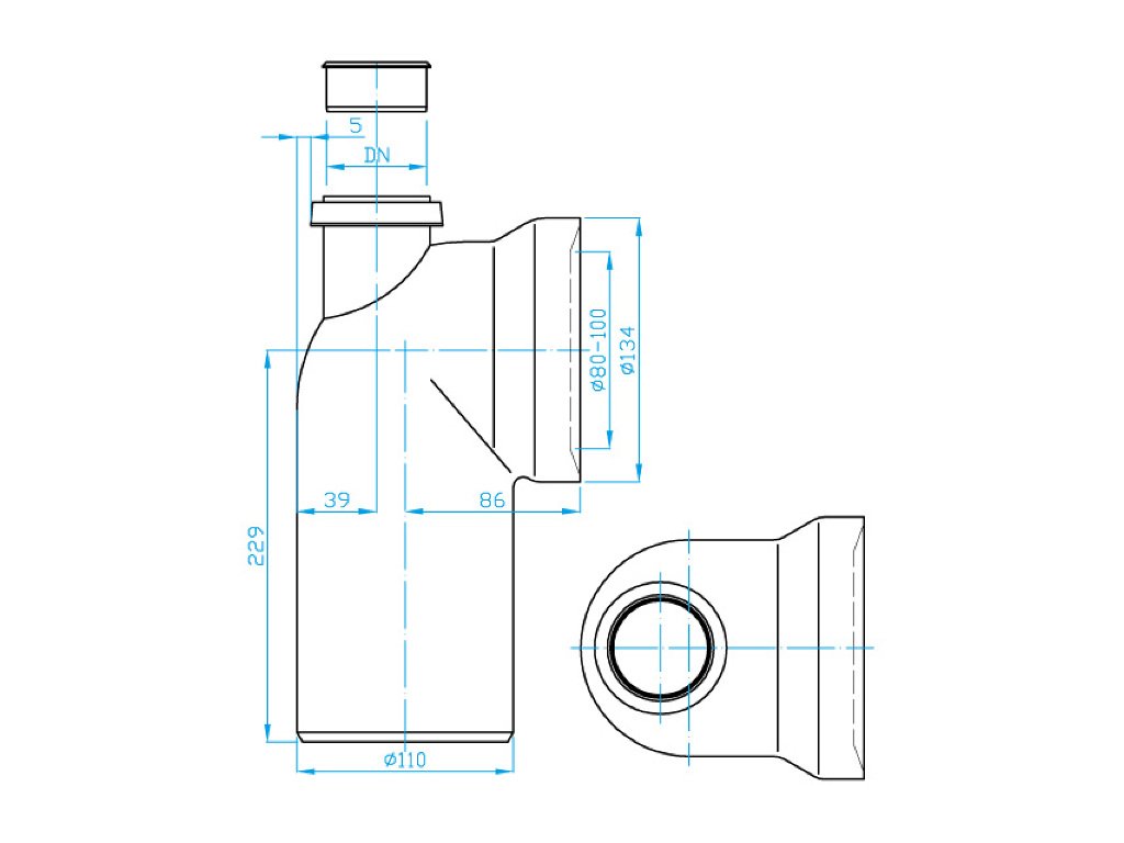 Dopojení k WC – koleno 90° x 110mm s odbočkou 50 mm- s odbočkou 50 mm