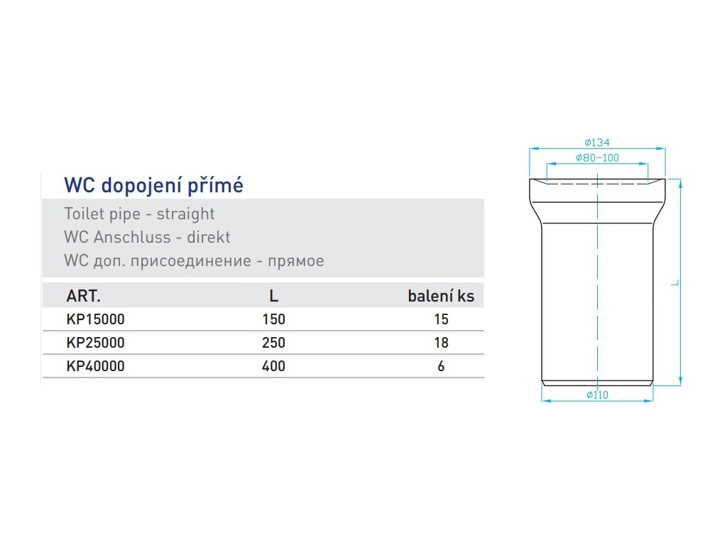 Připojovací WC přímý kus 110 x 400 mm - dopojení přímé s manžetou