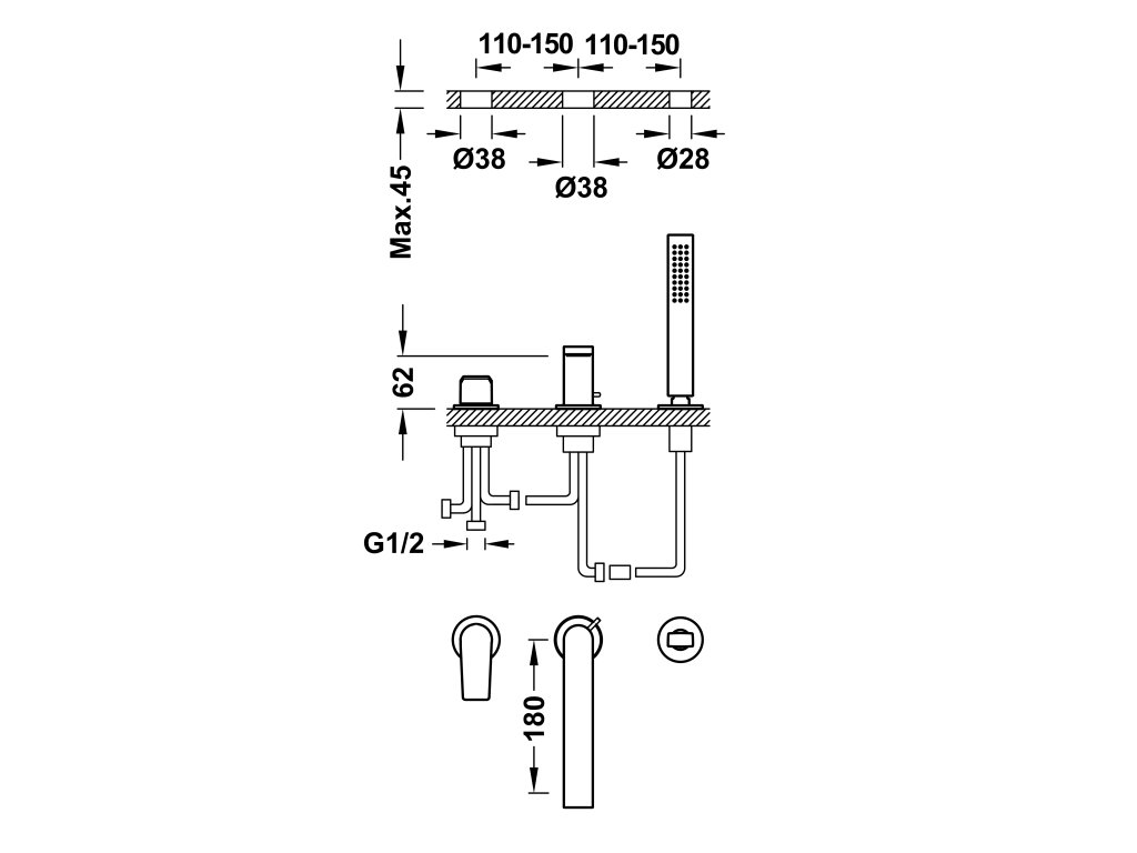 Vanová stojánková tříotvorová bateriePrůtok: 3 bar – 13 l/m