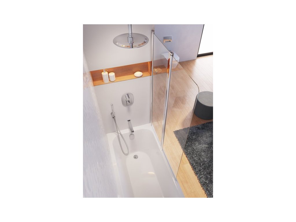 Díky otočnému sloupku lze její pohyblivý díl otevřít do vnitřního prostoru vany nebo vytočit ven. Šířka pevného dílu respektuje hloubku běžných umyvadel, a tak lze zástěnu přitisknout až přímo k němu.- rozměry: 100 cm