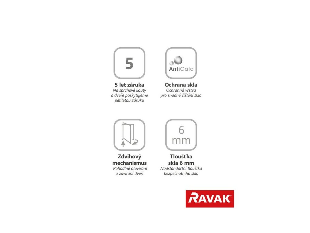Výrobek se skládá ze čtyř rovných dílů, z nichž dva tvoří otočné dveře. Montuje se do obloženého rohu koupelny na vaničky RAVAK Angela, Perseus, Perseus Pro, Perseus Pro Flat, Perseus Pro Chrome, Perseus Pro 10° nebo přímo na podlahu se zabudovaných odtokovým žlabem či podlahovou vpustí. Pomocí ustavovacího profilu lze vyrovnat stavební nerovnosti (až o 1,5 cm na každé straně). Součástí balení je 2× krátký držák. Ostatní rozměry a varianty sprchového koutu řešíme na míru.
