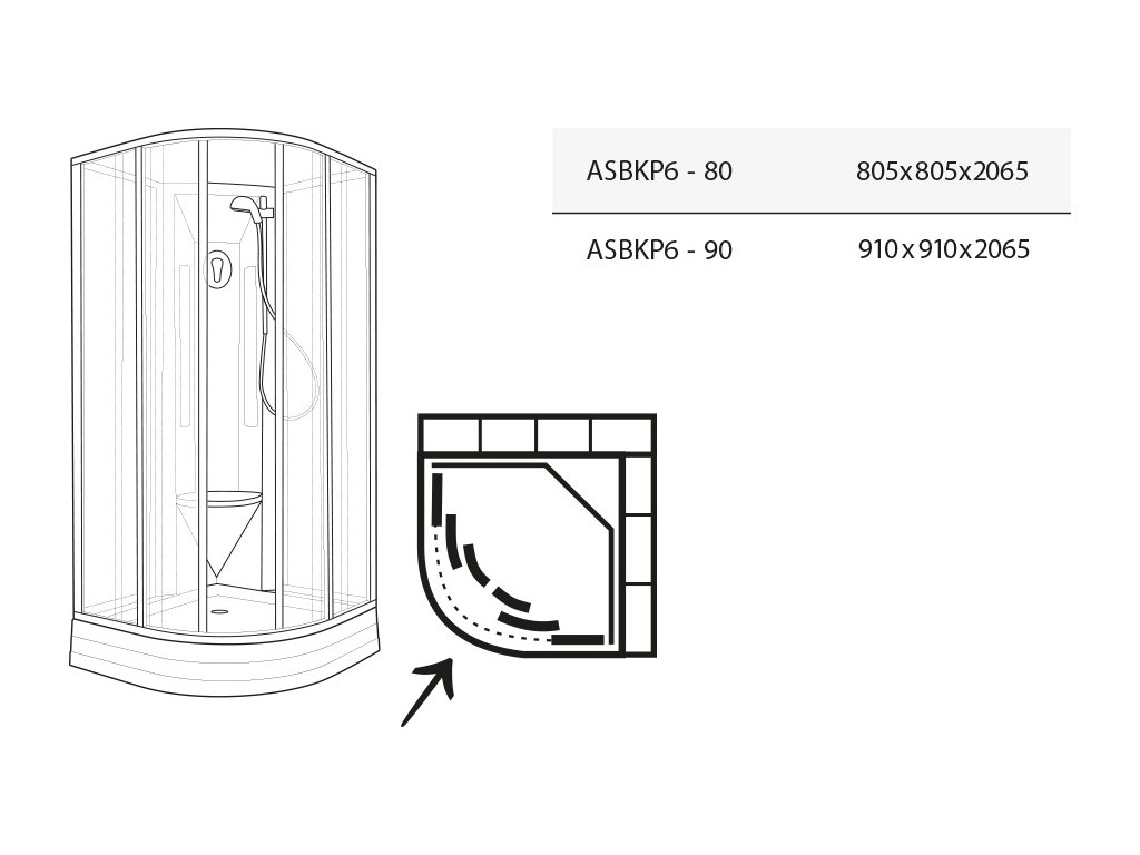 ASBKP6–90 BÍLÁ+TRANSPARENT (4 DÍLY) Čtvrtkruhový sprchový box, který vám zajišťuje absolutní nezničitelnost a okamžitou připravenost k používání. Postavte sprchový box, kam potřebujete, připojte na vodu a odpad – sprchování může začít. Díky rovným výplním rozděleným do šesti dílů nehrozí žádné riziko problémového provozu. Model ASBKP6 vás nikdy nezradí.