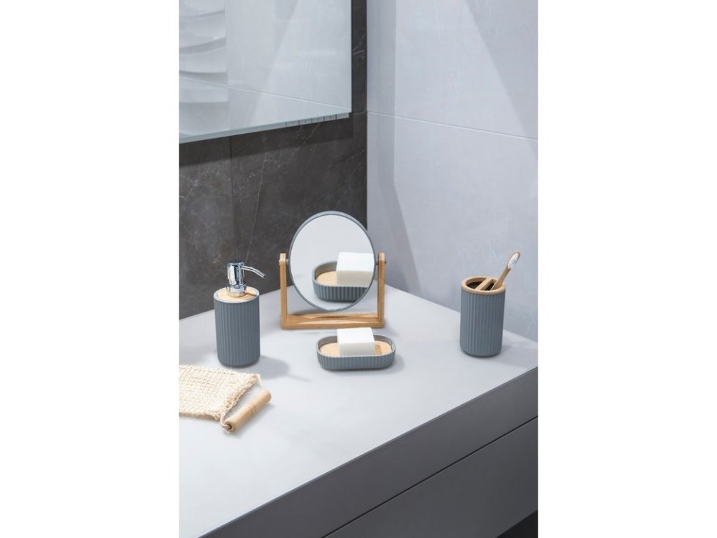 Sérii RAYAON je tvořena kelímkem na zubní kartáčky, mýdelníkem, WC štětkou, kosmetickým zrcátkem a dávkovačem mýdla.