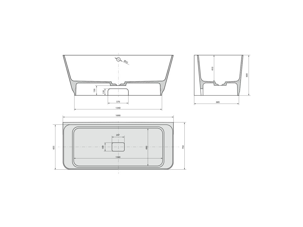 SKYLLA nástěnná stojící vana litý mramor 170x75x60cm; bílá mat