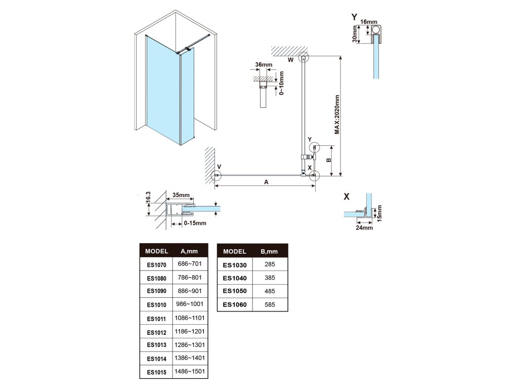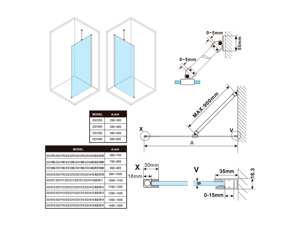 - Stěnové profily s tolerancí 15 mm usnadňují stabilní montáž zástěn, instalace je možná na dlažbu nebo sprchovou vaničku