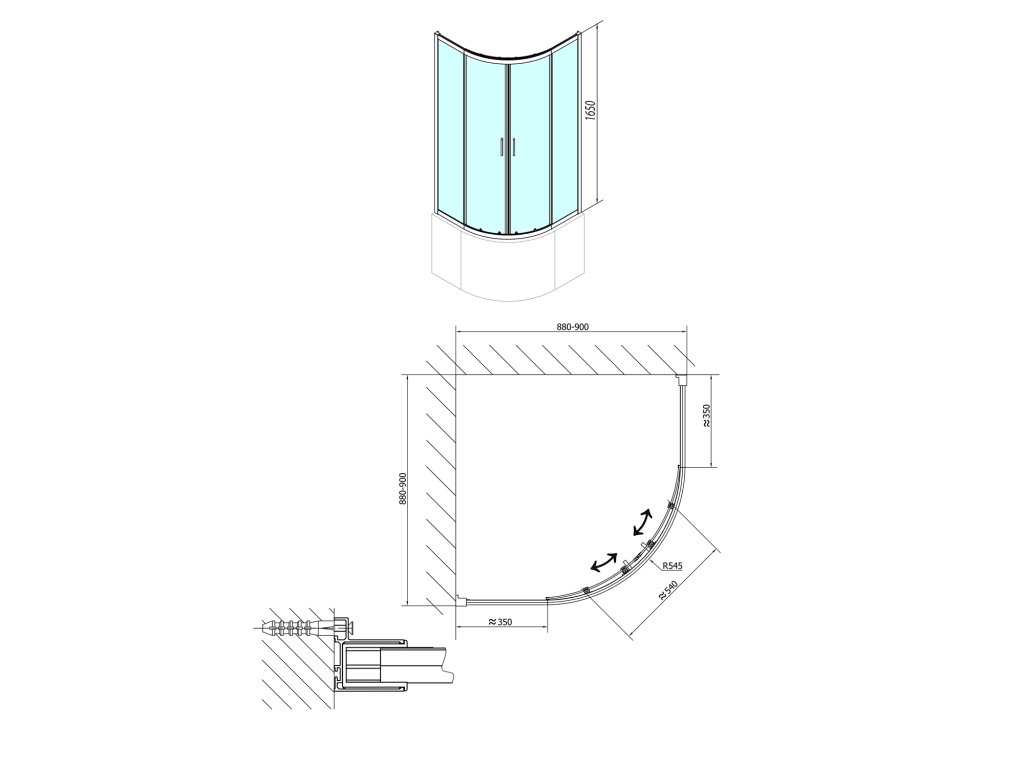 SELMA čtvrtkruhová sprchová zástěna 900x900x1650mm, čiré sklo