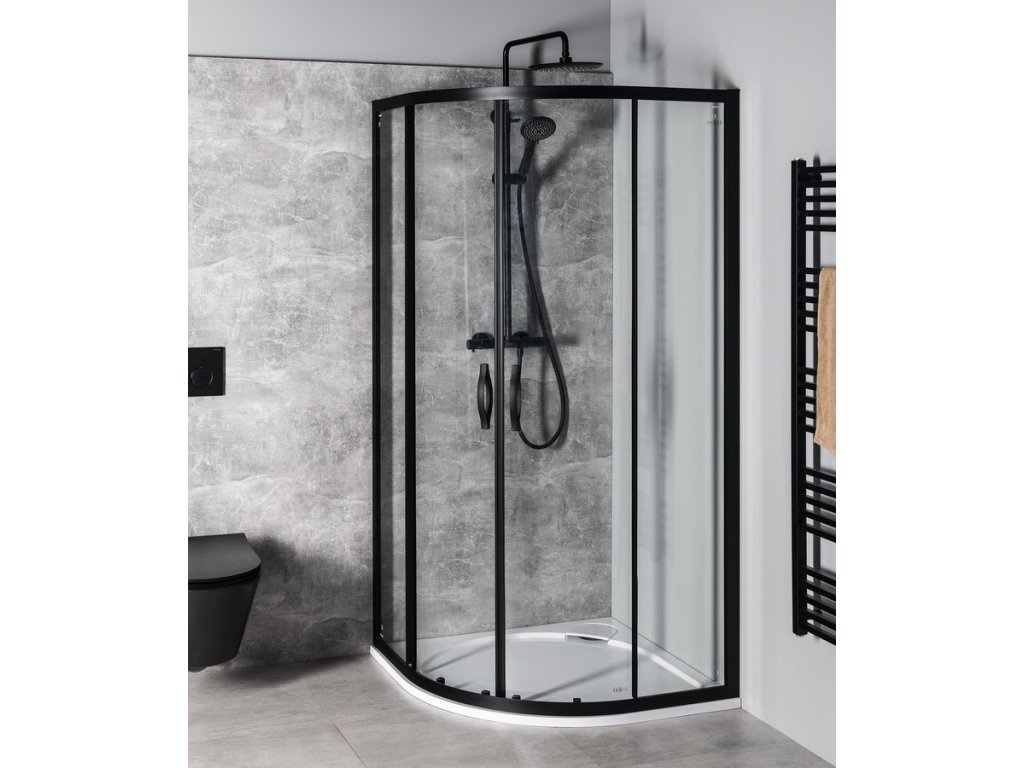 - Čtvrtkruhové zástěny a čtvrtkruhové zástěny s prodlouženou stěnou s posuvnými dveřmi