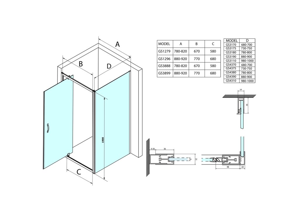 - Kombinací boční stěny a dveří získáte obdélníkovou/čtvercovou zástěnu - na výběr dveře posuvné a pivotové