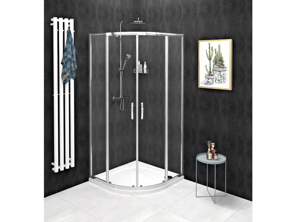 - Čtvrtkruhové zástěny a čtvrtkruhové zástěny s prodlouženou stěnou s posuvnými dveřmi