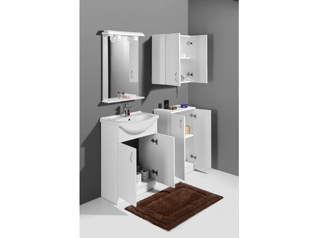 Koupelnový nábytek z bílého lamina, nejjednodušší řešení pro Vaši koupelnu. Nabídka umyvadlových skříněk ve 4 rozměrech v šířkách od 50 cm do 65 cm v kombinaci s několika variantami doplňkových skříněk nabízí příznivé uspořádání nábytku téměř do každé koupelny za nejlepší cenu.