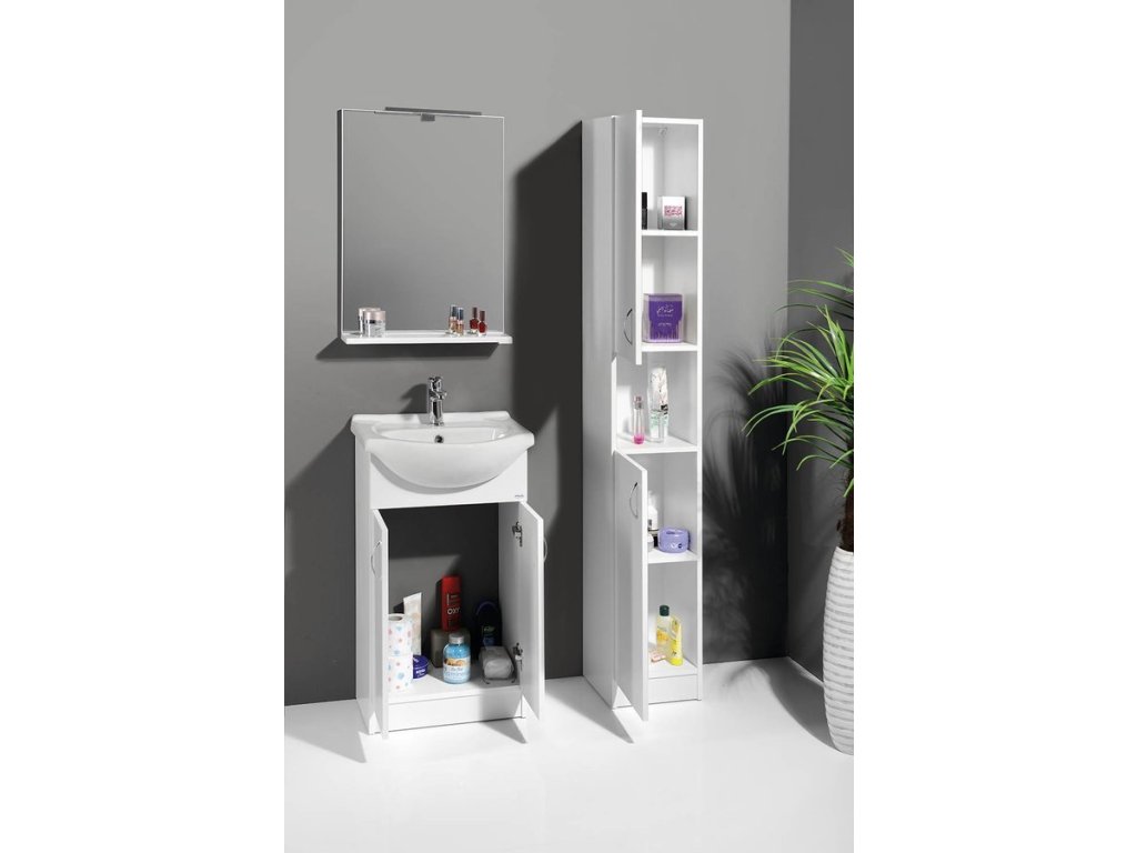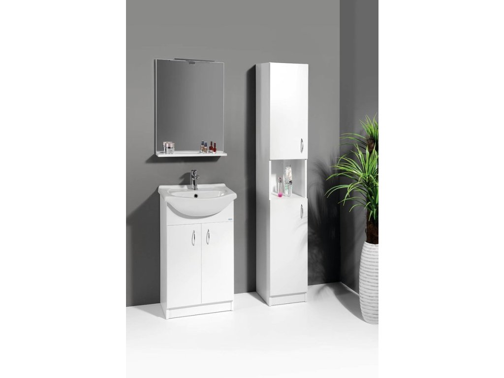 Koupelnový nábytek z bílého lamina, nejjednodušší řešení pro Vaši koupelnu. Nabídka umyvadlových skříněk ve 4 rozměrech v šířkách od 50 cm do 65 cm v kombinaci s několika variantami doplňkových skříněk nabízí příznivé uspořádání nábytku téměř do každé koupelny za nejlepší cenu.