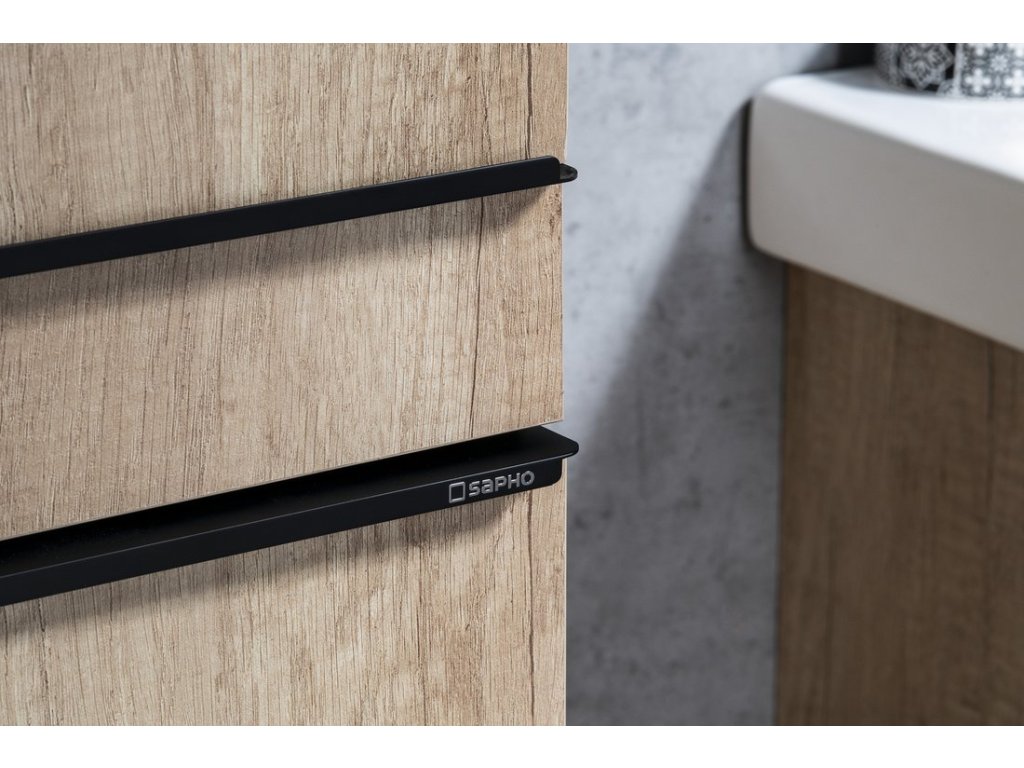 Série SITIA nabízí moderní vzhled díky tenké úchytce v matné bílé nebo černé barvě, umístěné po celé délce hrany zásuvek či dvířek. Použitím keramických umyvadel THALIE vytvoříme nadčasový koupelnový nábytek. Zásuvky jsou vybaveny výsuvy s pomalým dojezdem a automatickým dovřením, dvířka mají kování s tlumeným dovíráním. Horní i spodní zásuvky lze doplnit organizérem nebo miskami LINDO pro uložení předmětů každodenní potřeby. Série dále nabízí 2 rozměry doplňkových skříněk ve stejném designu.