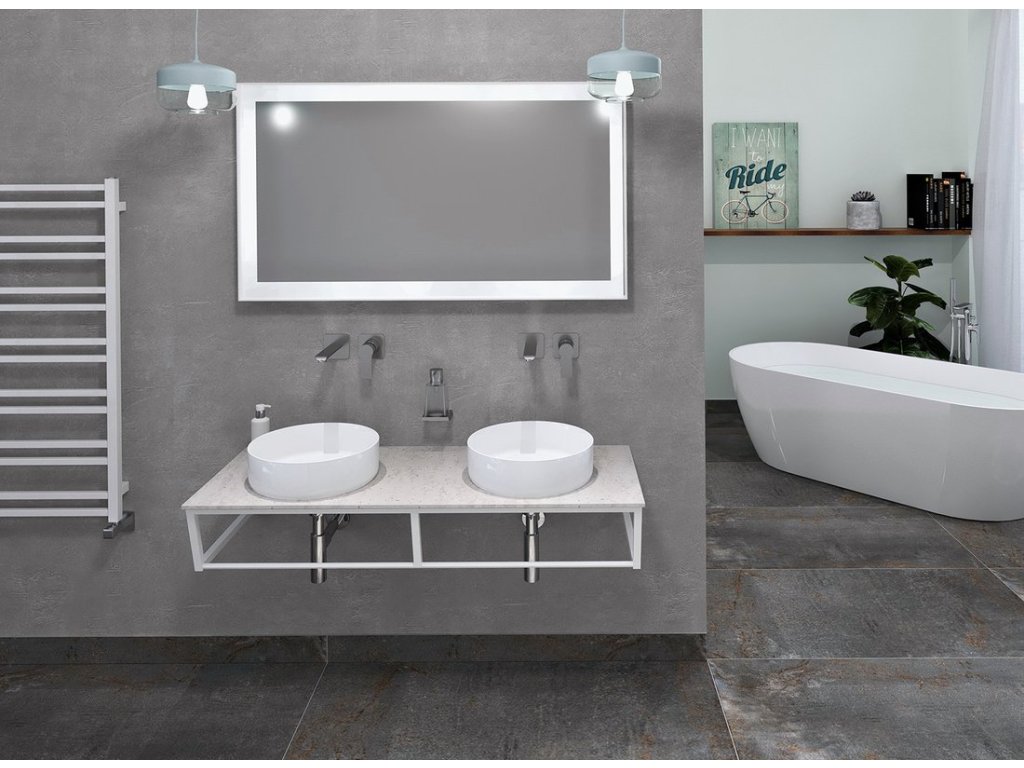 Desky doporučujeme doplnit umyvadly na postavení. Otvory pro odpad umyvadla a stojánkovou vodovodní baterii lze vyvrtat před montáží desky korunkovým vrtákem. Na přání je možné otvory připravit už ve výrobě dle dodaného výkresu.