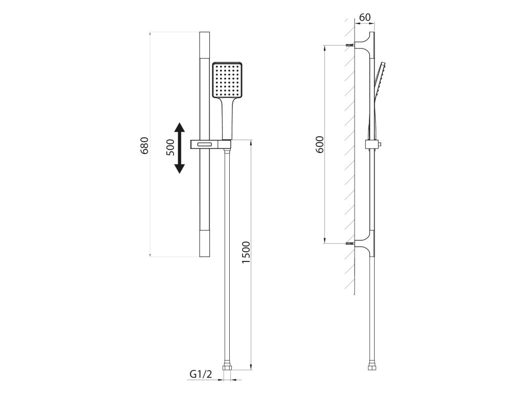 Sprchová souprava hranatá, posuvný držák 680mm, černá mat