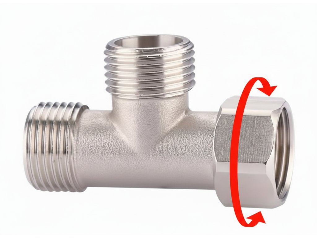 T-kus DN 15 s převlečnou otočnou maticí. Slouží pro jednoduché připojování a rozbočování.