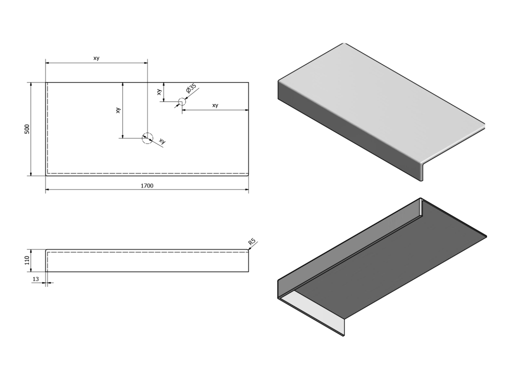 - Možnost dodání s otvory pro baterii a odpad dle výkresu (lze vrtat i v místě instalace)