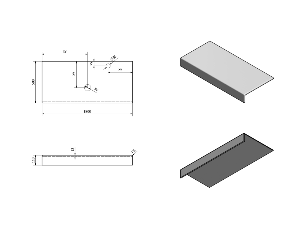 - Možnost dodání s otvory pro baterii a odpad dle výkresu (lze vrtat i v místě instalace)