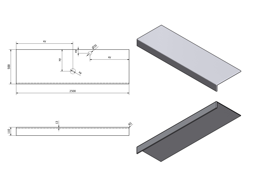 - Možnost dodání s otvory pro baterii a odpad dle výkresu (lze vrtat i v místě instalace)