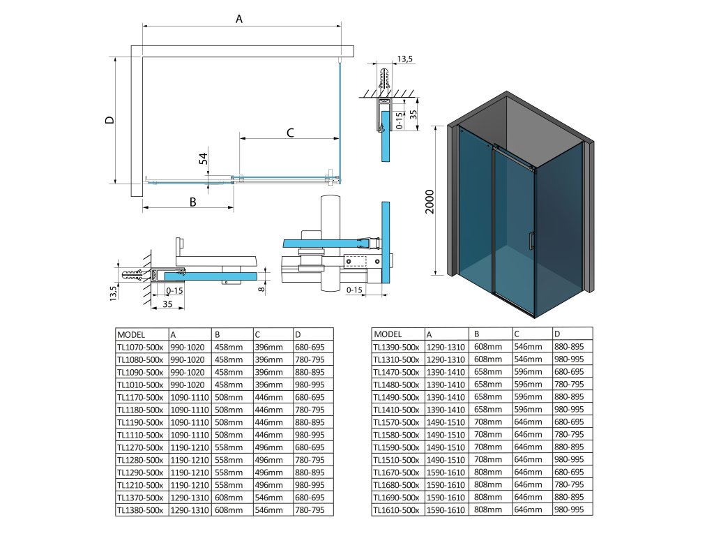 - Dveře jsou děleny na část posuvnou a pevnou - umožňují variabilní instalaci s levým nebo pravým otevíráním
