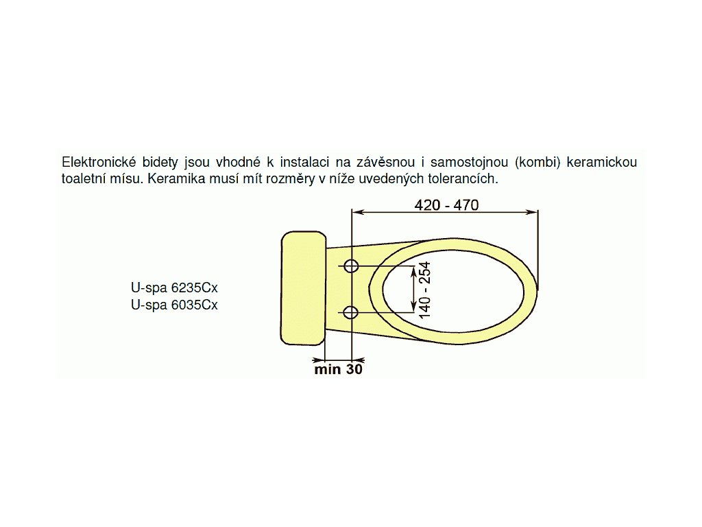 Bidet lze instalovat na Vaši stávající toaletní mísu. Abyste před pořízením bidetu měli úplnou jistotu, že bude vhodný na Vaši stávající toaletní mísu, doporučujeme ověřit, zda rozměry této mísy odpovídají rozměrovému náčrtku. V dosahu 1,5 m od bidetu je nutno umístit zásuvku 230V/50Hz.