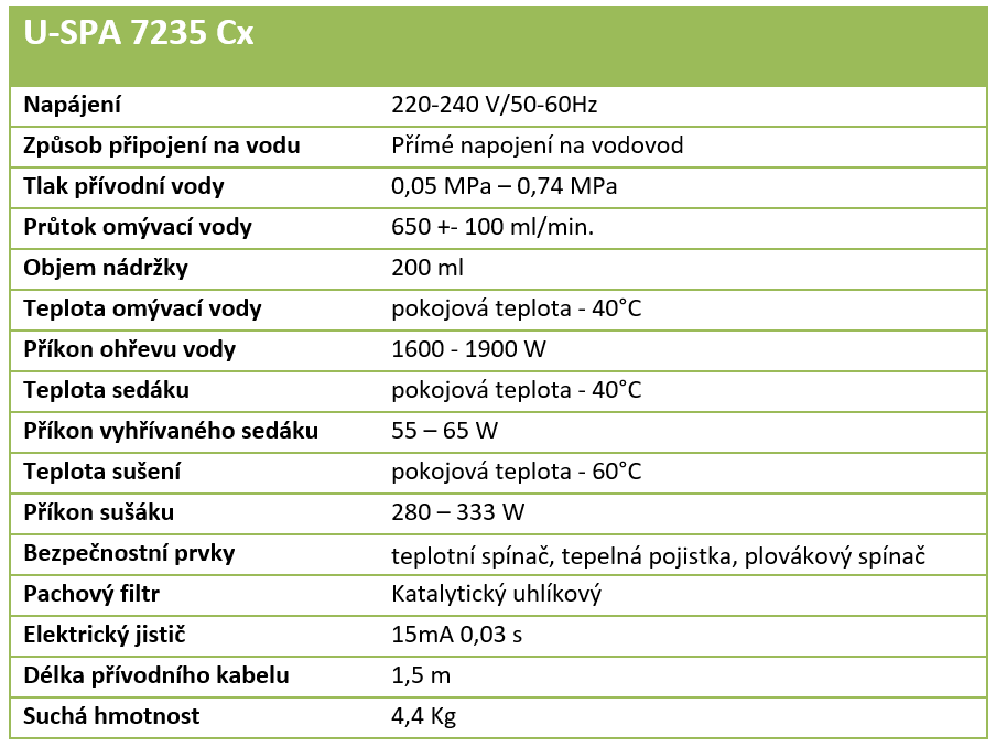 Technická specifikace bidetového sedátka U-spa 7235Cx