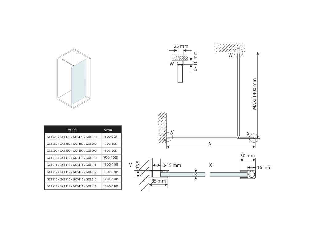 - Zástěny v šířkách 700 až 1400 mm