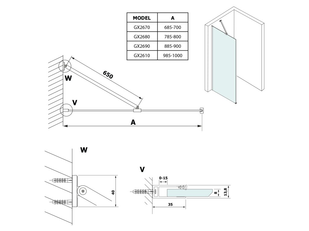 - Stěnové profily s tolerancí 15 mm usnadňují stabilní montáž zástěn, instalace je možná na dlažbu nebo sprchovou vaničku