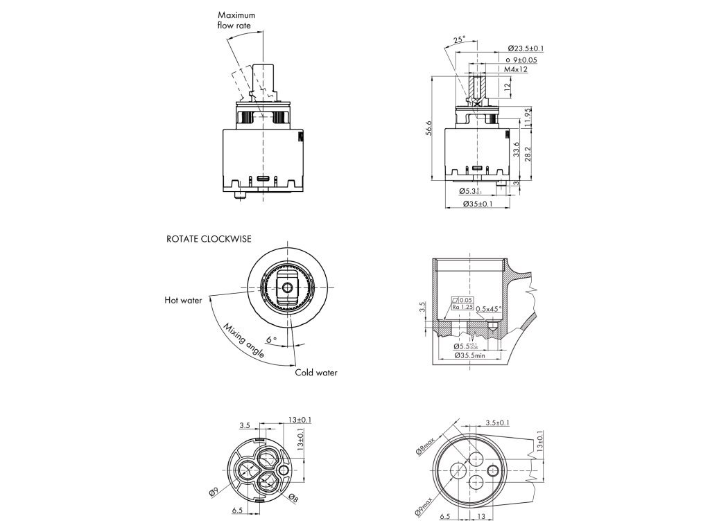 Systém úspory spotřeby vody a energie: V základní poloze vytéká studená voda, postupným otáčením páky doleva se přidává voda teplá. Průtok vody je regulován zvednutím páky baterie.