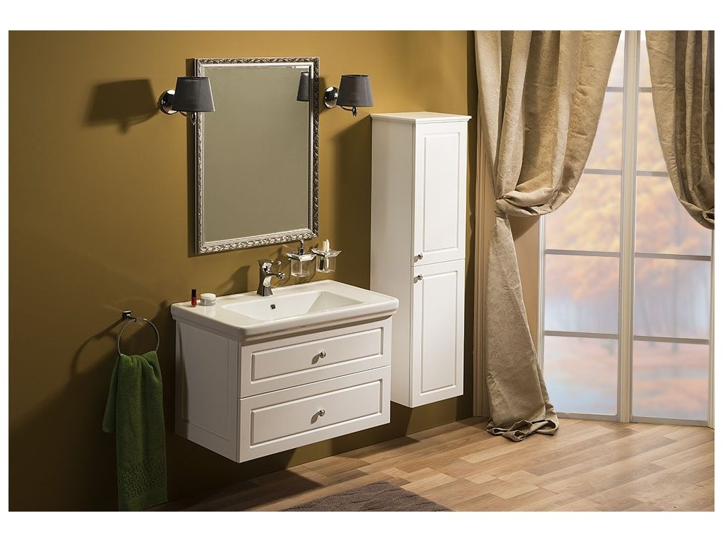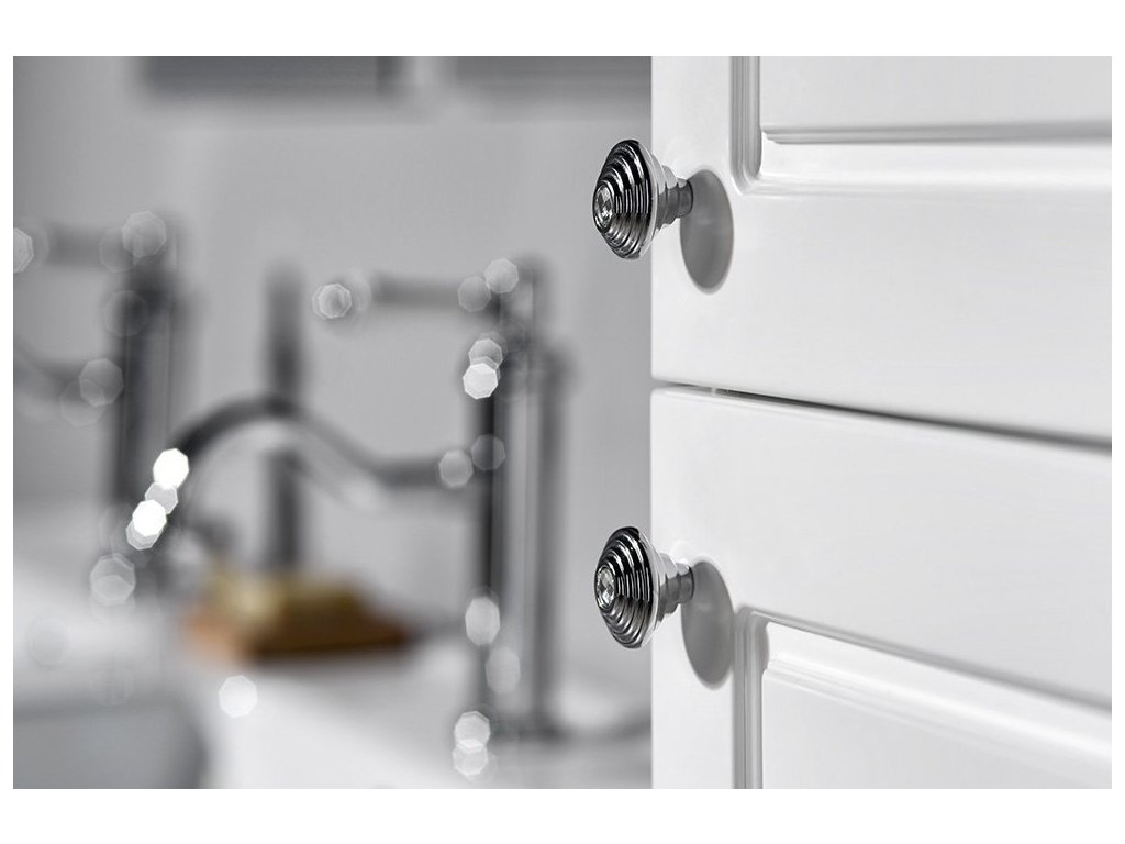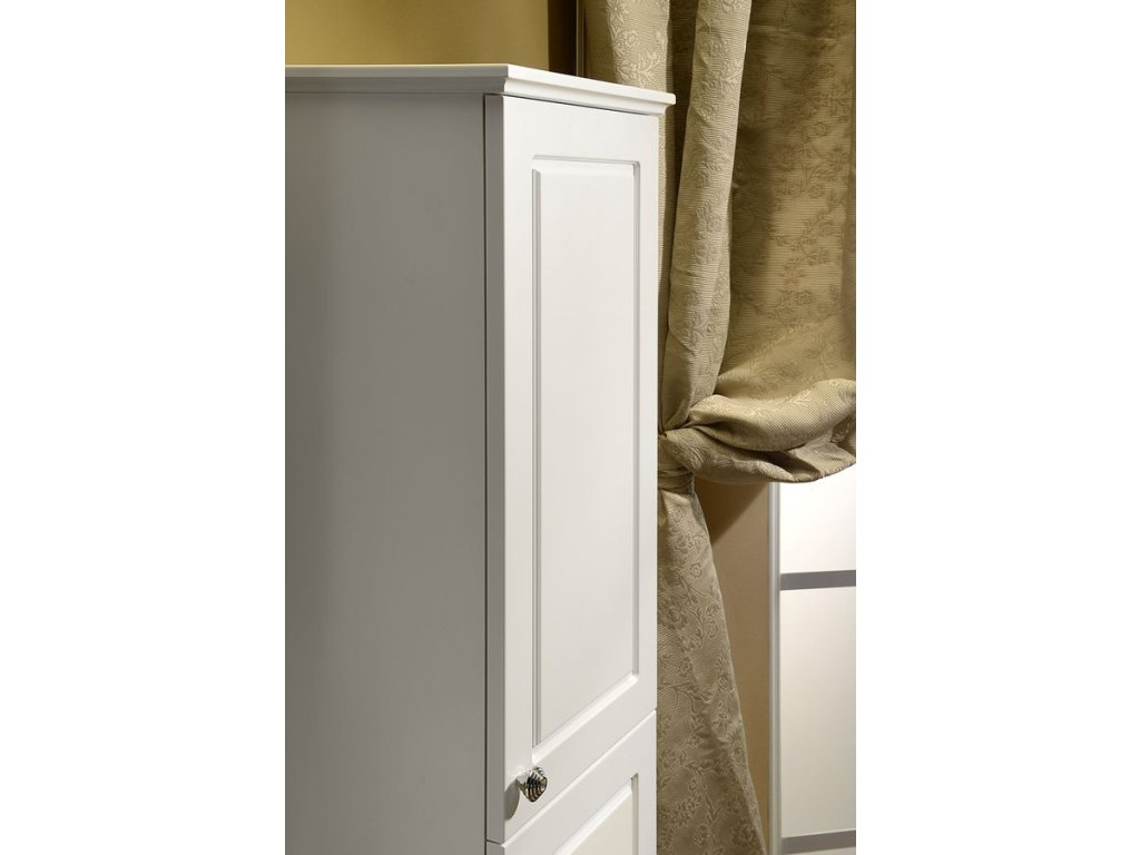 Skříňky VIOLETA ve vintage stylu s plastickým dekorem na zásuvkách i korpusu, doplněné úchytkou s krystalem SWAROVSKI, jsou vyráběny v bílém pololesklém provedení.
