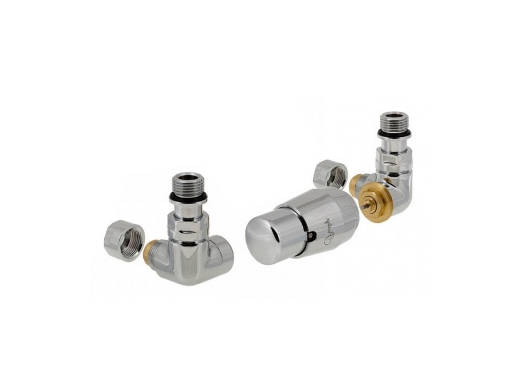 Designová termostatická sada VISION – lesklý chrom, pravá včetně svěrných matic Pex, Alpex 16×2mmDesignový termostatický ventil osazený termostatickou hlavicí v sadě s regulačním šroubením VISION slouží pro připojení otopného tělesa se spodním krajním připojením k rozvodu.