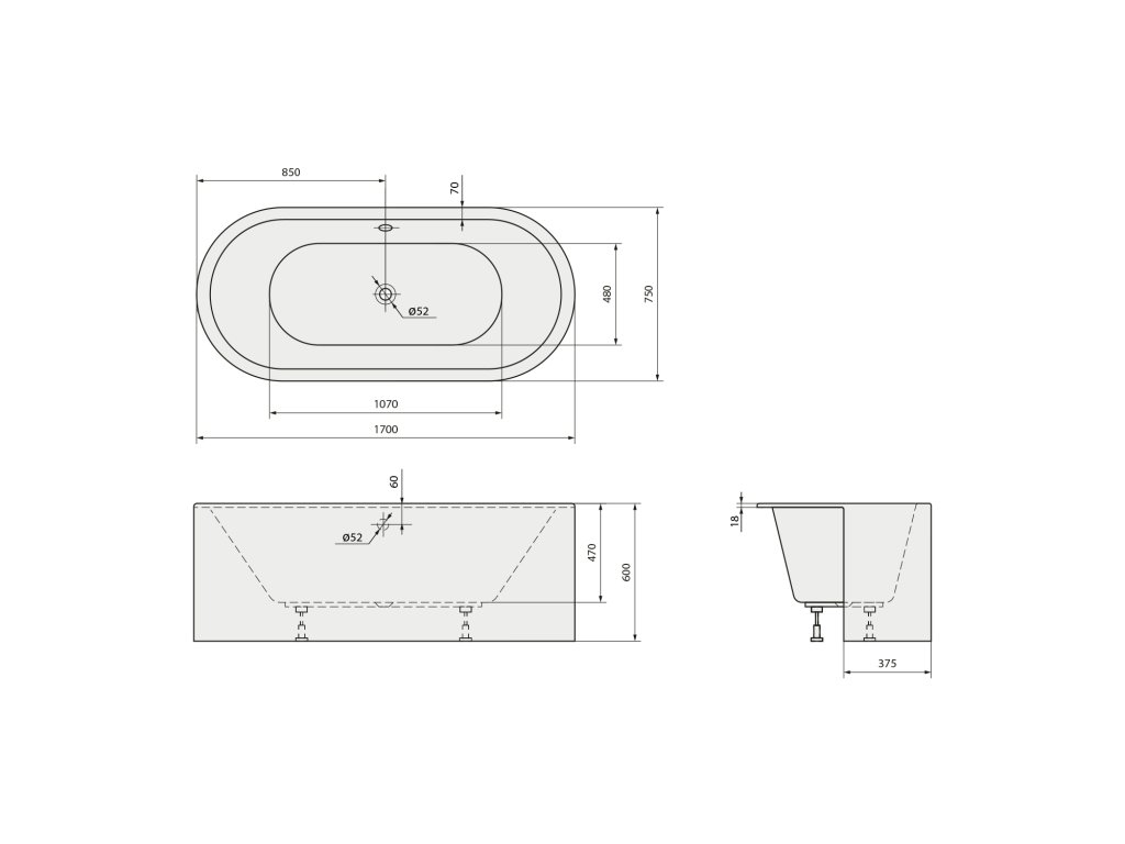 VIVA C MONOLITH oválná polozápustná vana 170x75x60cm, bílá