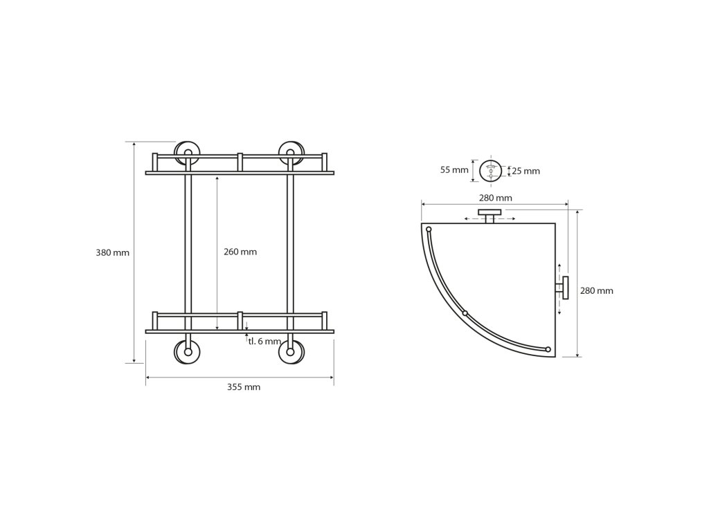 X-ROUND E skleněná polička rohová dvojitá s hrazdou 280x355x380mm; chrom